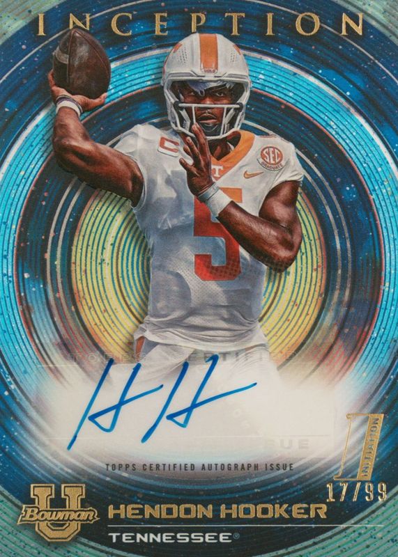The Hendon Hooker 2022 Bowman University Inception #BIA-HH Autographs - Blue Foil /99 (1st) card in Raw condition has not changed in price in the last 30 days and was last sold for $46.00 .