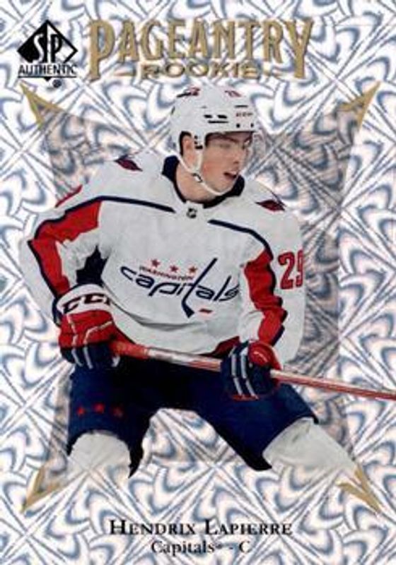 The Hendrix Lapierre 2021 SP Authentic #P-73 Pageantry Rookie card is 1 of 19 Hendrix Lapierre's card variations in the 2021 SP Authentic set being tracked by Sports Card Investor, including Black Autographs, Limited Red, Limited Gold /99, Future Watch Inscribed /50, and Limited Black /1.