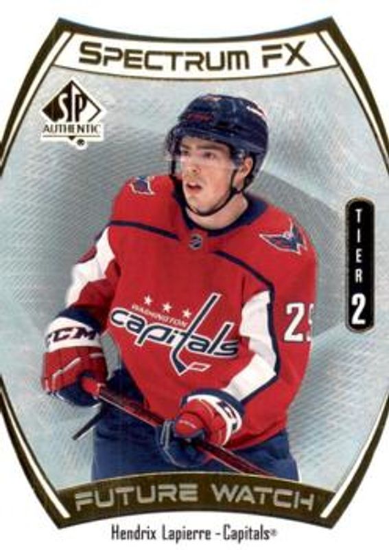 The Hendrix Lapierre 2021 SP Authentic #S-76 Spectrum FX Rookie card is 1 of 19 Hendrix Lapierre's card variations in the 2021 SP Authentic set being tracked by Sports Card Investor, including Black Autographs, Limited Red, Limited Gold /99, Future Watch Inscribed /50, and Limited Black /1.