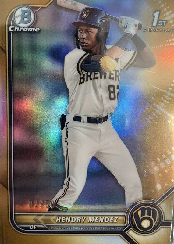 The Hendry Mendez 2022 Bowman #BCP-88 Chrome Prospects - Gold Refractor /50 (1st) card in Raw condition has not changed in price in the last 30 days and was last sold for $40.00 .