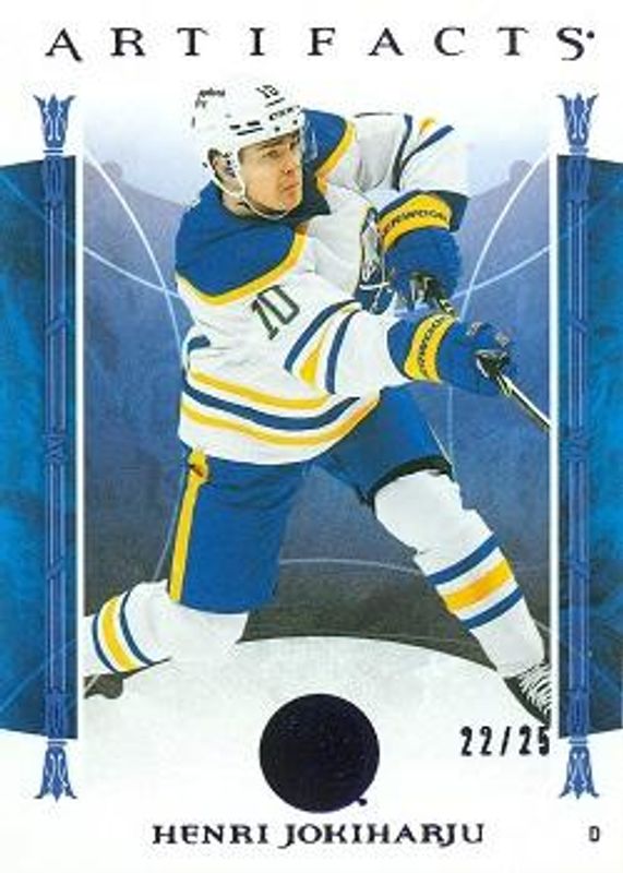The Henri Jokiharju 2022 Upper Deck Artifacts #47 Purple /25 card is 1 of 21 Henri Jokiharju's card variations in the 2022 Upper Deck Artifacts set being tracked by Sports Card Investor, including Base /999, Turquoise, Ruby /499, Copper /299, and Royal Blue /199.