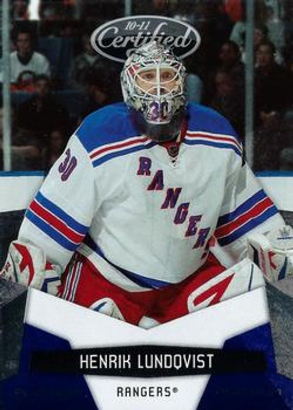 The Henrik Lundqvist 2010 Certified #95 Platinum Blue /250 card is 1 of 44 Henrik Lundqvist's card variations in the 2010 Certified set being tracked by Sports Card Investor, including Base /799, Platinum Red /999, Mirror Red Materials Dual /150, Mirror Blue Materials /100, and Mirror Red /100.