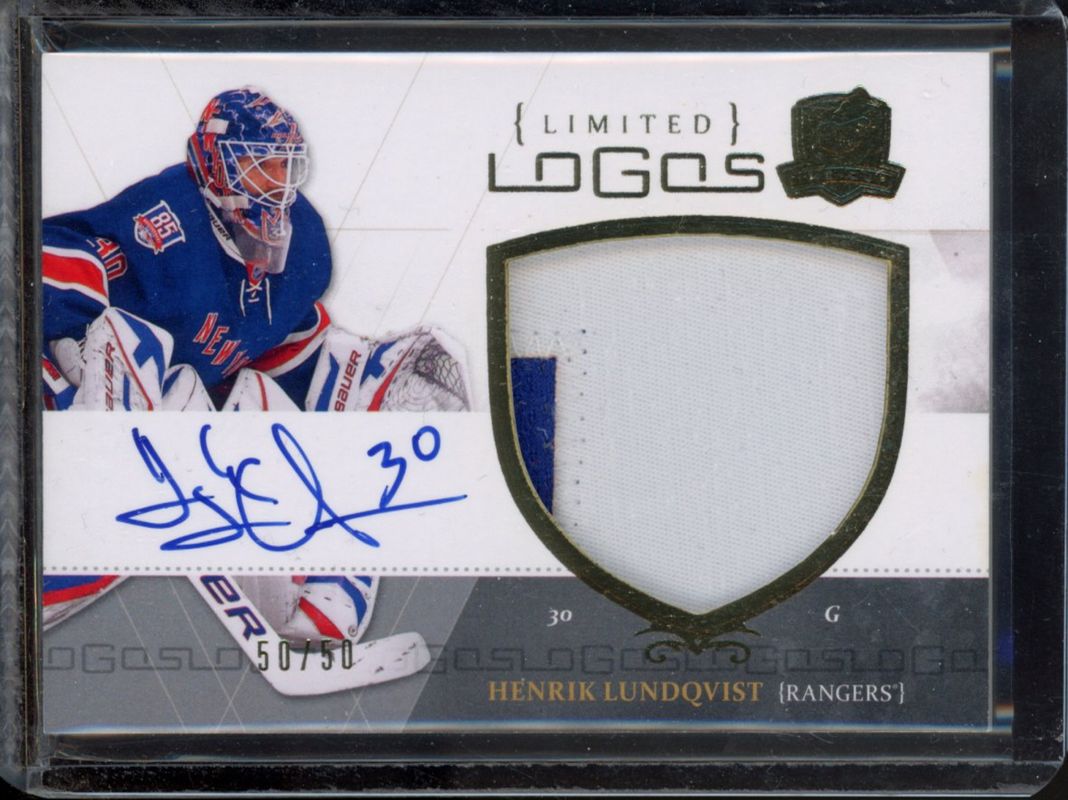 The Henrik Lundqvist 2010 Upper Deck The Cup #LL-HL Limited Logos Autographs /50 card is 1 of 19 Henrik Lundqvist's card variations in the 2010 Upper Deck The Cup set being tracked by Sports Card Investor, including Base /199, Gold /25, Gold Rainbow /25, Black /1, and Printing Plates Black /1.