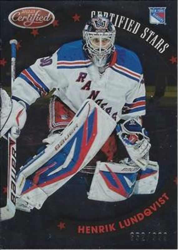 The Henrik Lundqvist 2012 Certified #S4 Certified Stars /999 card is 1 of 16 Henrik Lundqvist's card variations in the 2012 Certified set being tracked by Sports Card Investor, including Base /999, Mirror Red /100, Mirror Hot Box /75, Mirror Blue /50, and Mirror Gold /25.