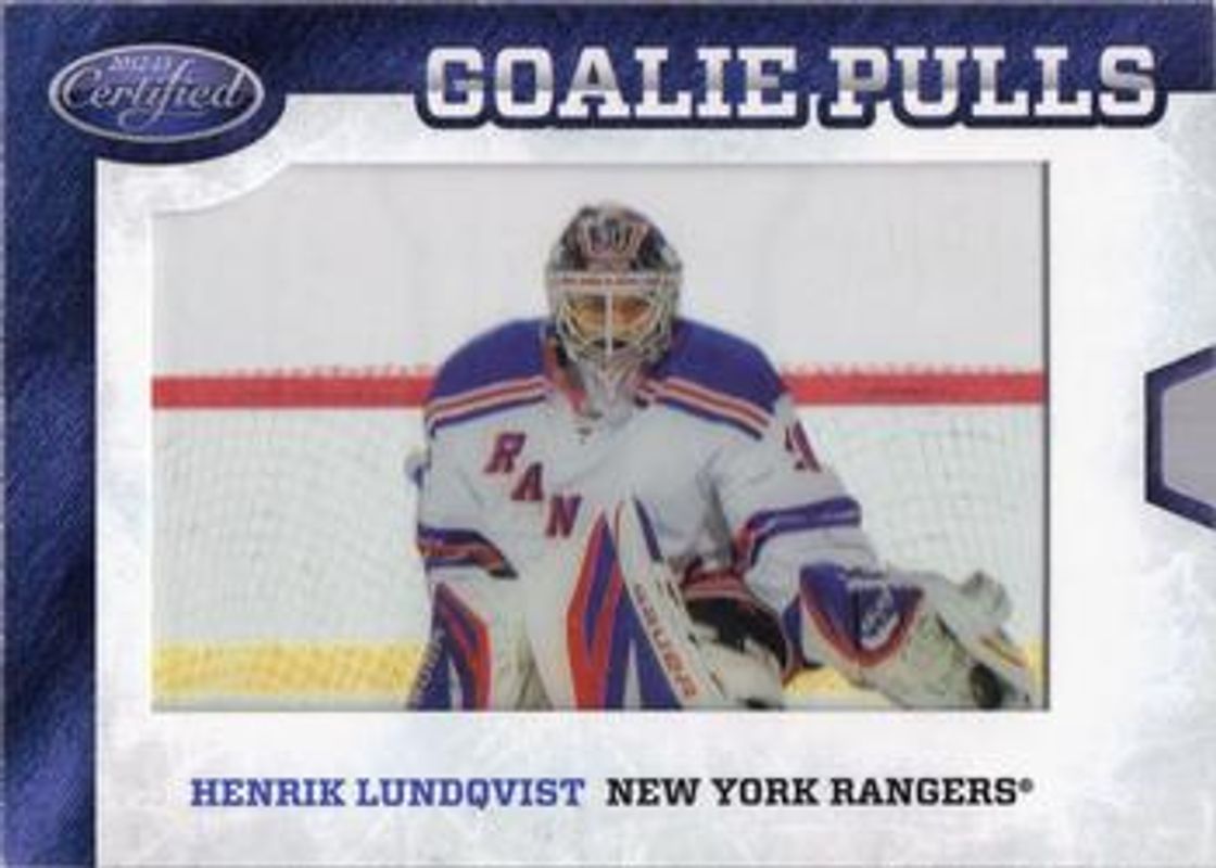 The Henrik Lundqvist 2012 Certified #GP47 Goalie Pulls card is 1 of 16 Henrik Lundqvist's card variations in the 2012 Certified set being tracked by Sports Card Investor, including Base /999, Mirror Red /100, Mirror Hot Box /75, Mirror Blue /50, and Mirror Gold /25.