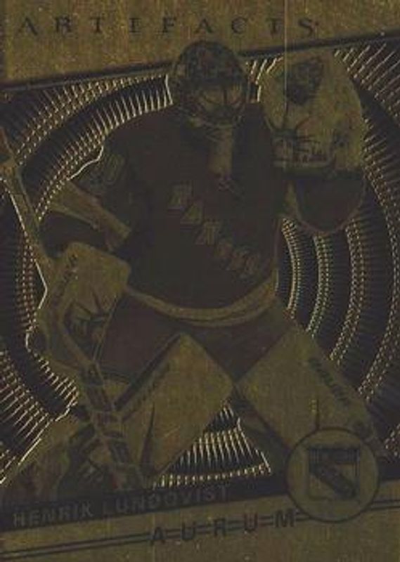 The Henrik Lundqvist 2018 Upper Deck Artifacts #A-30 Aurum card is 1 of 17 Henrik Lundqvist's card variations in the 2018 Upper Deck Artifacts set being tracked by Sports Card Investor, including Base /799, Ruby /349, Emerald /99, Aqua /45, and Purple /20.