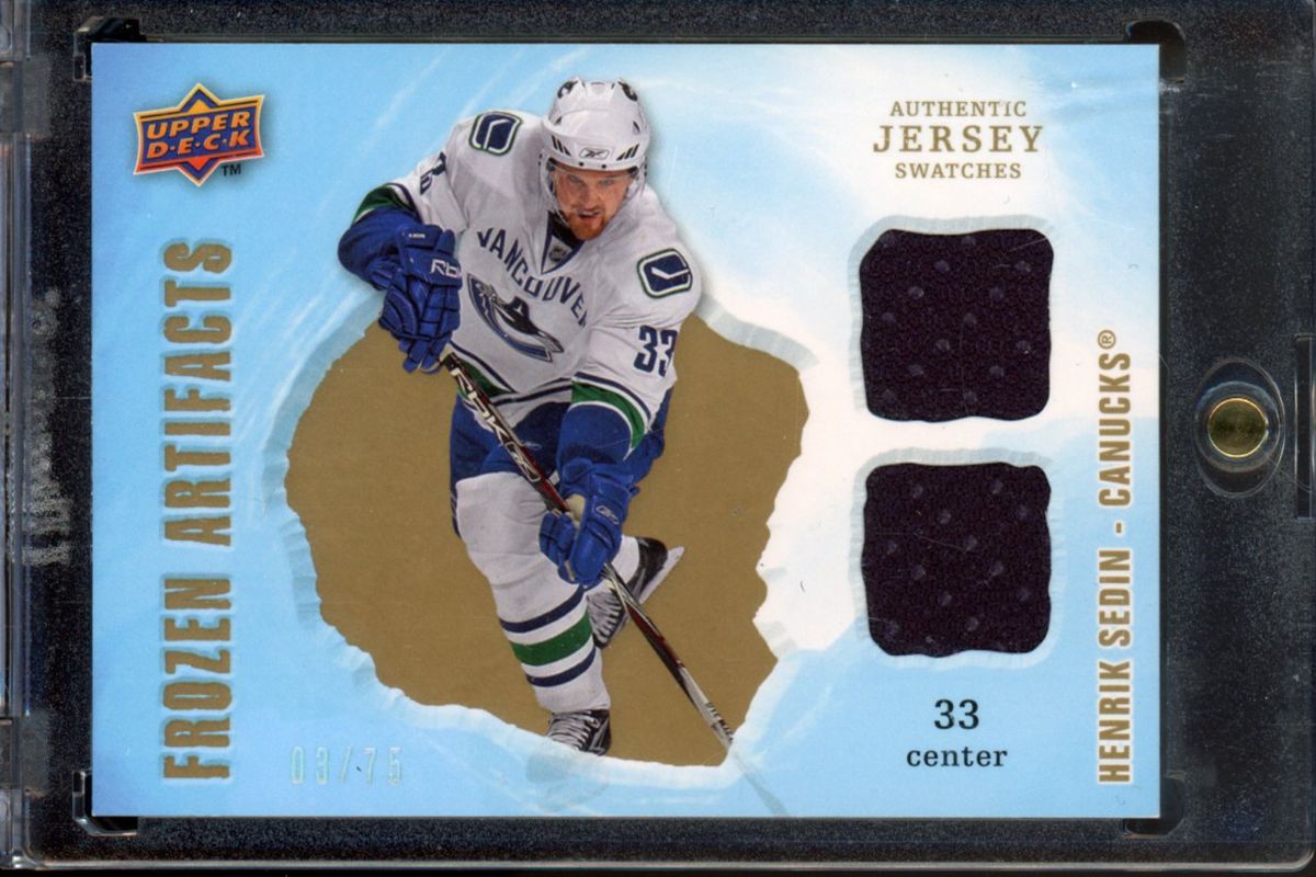 The Henrik Sedin 2008 Upper Deck Artifacts #FAD-HS Frozen Artifacts Dual - Gold /75 card is 1 of 37 Henrik Sedin's card variations in the 2008 Upper Deck Artifacts set being tracked by Sports Card Investor, including #6 Base /999, #153 Base /999, #153 Gold /75, #6 Blue /50, and #153 Blue /50.