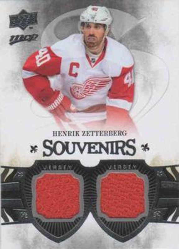 The Henrik Zetterberg 2014 Upper Deck MVP #SJS-HZ Souvenirs Combos card is 1 of 10 Henrik Zetterberg's card variations in the 2014 Upper Deck MVP set being tracked by Sports Card Investor, including Base, Colors & Contours, Silver Script, Gold Script /100, and Super Script /25.