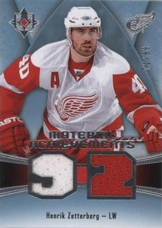The Henrik Zetterberg 2015 Upper Deck Ultimate Collection #MA-HZ Material Achievements /99 card is 1 of 12 Henrik Zetterberg's card variations in the 2015 Upper Deck Ultimate Collection set being tracked by Sports Card Investor, including Base /149, Jersey Relics Gold Patch /25, Jersey Relics Platinum Blue Relic /5, Honoured Materials /99, and Jumbo Materials /40.