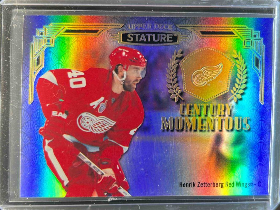 The Henrik Zetterberg 2020 Upper Deck Stature #CM-12 Century Momentous card is 1 of 27 Henrik Zetterberg's card variations in the 2020 Upper Deck Stature set being tracked by Sports Card Investor, including Base /399, Autographs /199, Green /175, Portrait /99, and Autographs Green /85.