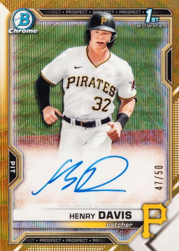 The Henry Davis 2021 Bowman Draft #CDA-HD Chrome DP Auto - Gold Wave Refractor /50 (1st) card in Raw condition has not changed in price in the last 30 days and was last sold for $250.00 .
