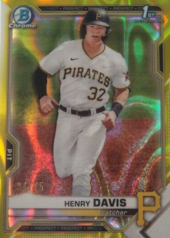 The Henry Davis 2021 Bowman Draft #BDC-48 Chrome - Yellow Lava Refractor /75 (1st) card in Raw condition has not changed in price in the last 30 days and was last sold for $136.50 .