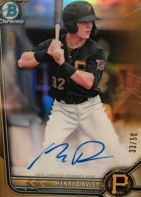 The Henry Davis 2022 Bowman #CPA-HD Chrome Prospect Auto - Gold Refractor /50 card in Raw condition has not changed in price in the last 30 days and was last sold for $139.00 .