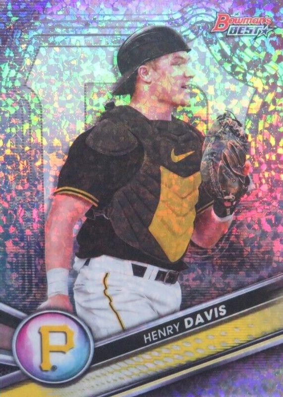 This card is 1 of 17 Henry Davis' card variations in the 2022 Bowman's Best set being tracked by Sports Card Investor, including Top Prospects, Top Prospects - Atomic Refractor, Top Prospects - Refractor, Top Prospects - Purple Refractor /250, and Top Prospects - Aqua Lava Refractor /199.