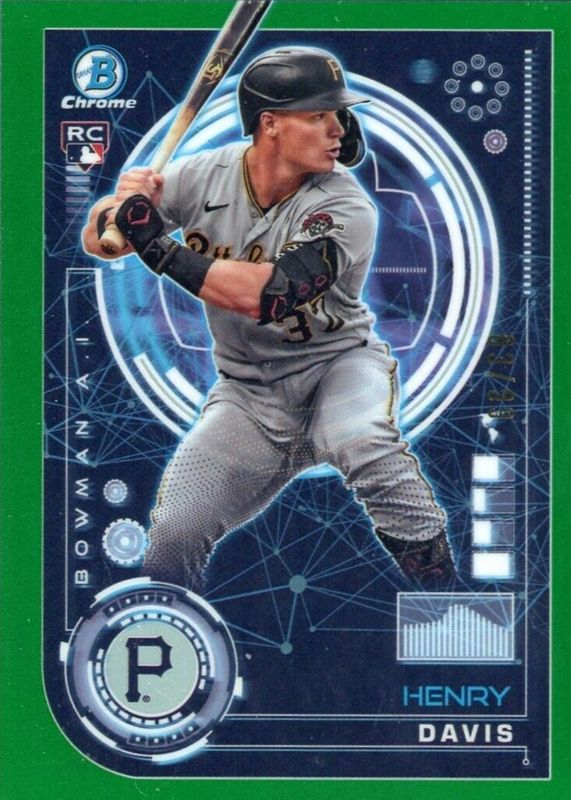 The Henry Davis 2024 Bowman #BAI-2 Bowman AI - Green Refractor /99 Rookie card in Raw condition has not changed in price in the last 30 days and was last sold for $16.99 .
