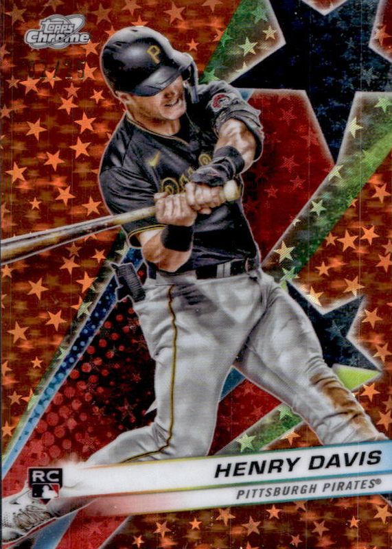The Henry Davis 2024 Topps Chrome Cosmic #SF-18 Starfractor - Orange Galactic Refractor /25 Rookie card in Raw condition has not changed in price in the last 30 days and was last sold for $23.79 .