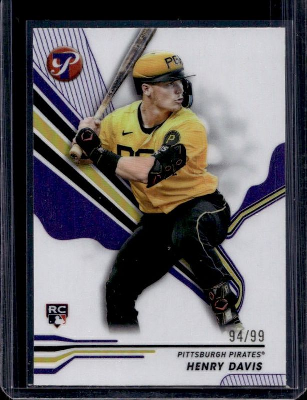 The Henry Davis 2024 Topps Pristine #196 Purple Refractor /99 Rookie card is 1 of 26 Henry Davis' card variations in the 2024 Topps Pristine set being tracked by Sports Card Investor, including Base, Pristine Refractor, Refractor, Green Refractor /150, and Pristine Purple Refractor /99.