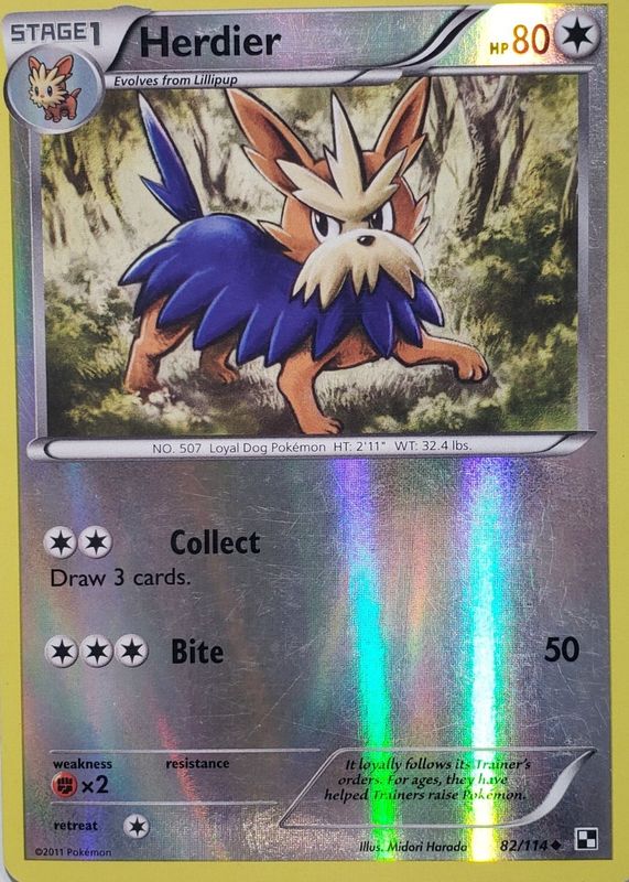 The Herdier 2011 Black & White #082/114 Reverse Holo card in Raw TCG (Lightly Played) condition has not changed in price in the last 30 days and was last sold for $2.49 .