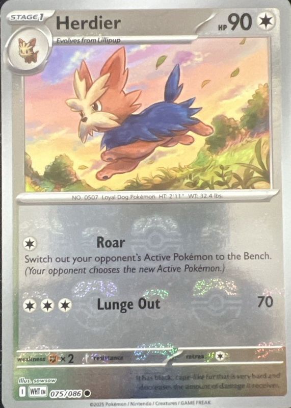 Herdier 2025 Scarlet & Violet: White Flare #075/086 Master Ball Reverse Holo RAW TCG (LIGHTLY PLAYED) Price Guide