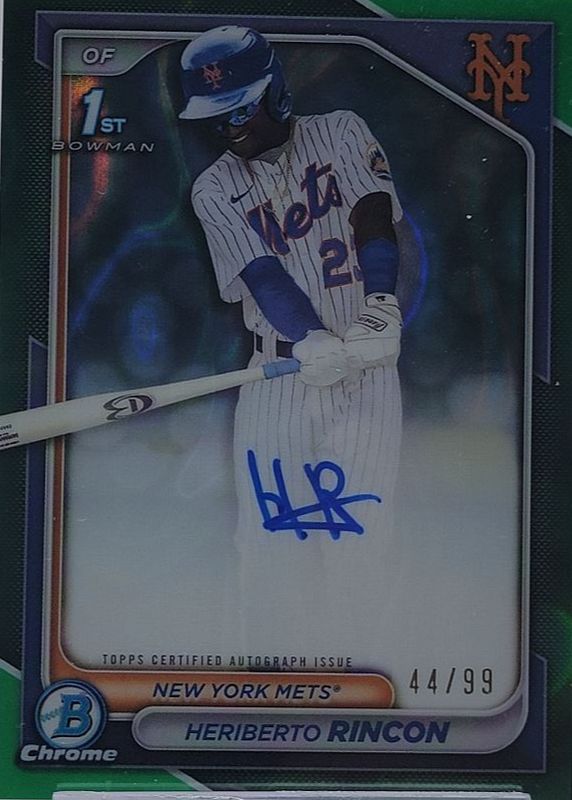 This card is 1 of 25 Heriberto Rincon's card variations in the 2024 Bowman Chrome set being tracked by Sports Card Investor, including Prospect Auto (1st), Prospect Auto - Refractor /499 (1st), Prospect Auto - Speckle Refractor /299 (1st), Prospect Auto - Purple Refractor /250 (1st), and Prospect Auto - Blue RayWave Refractor /150 (1st).