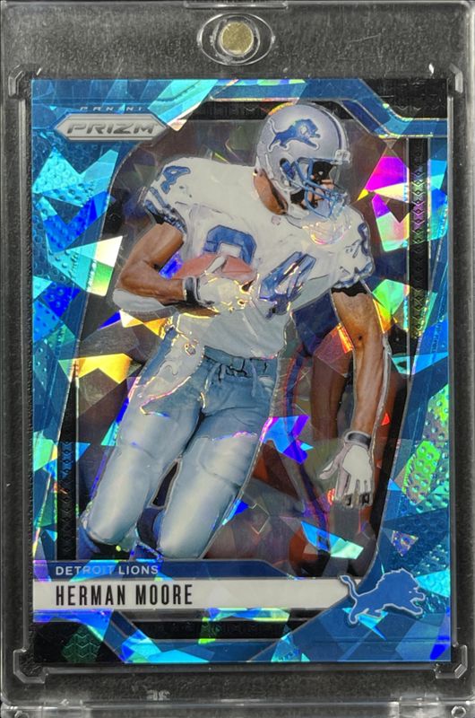 The Herman Moore 2024 Prizm #100 Blue Ice /99 card is 1 of 83 Herman Moore's card variations in the 2024 Prizm set being tracked by Sports Card Investor, including Base, Choice Blue Yellow Green, Choice Silver, Disco, and Green.