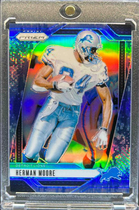The Herman Moore 2024 Prizm #100 Navy Camo /25 card is 1 of 83 Herman Moore's card variations in the 2024 Prizm set being tracked by Sports Card Investor, including Base, Choice Blue Yellow Green, Choice Silver, Disco, and Green.