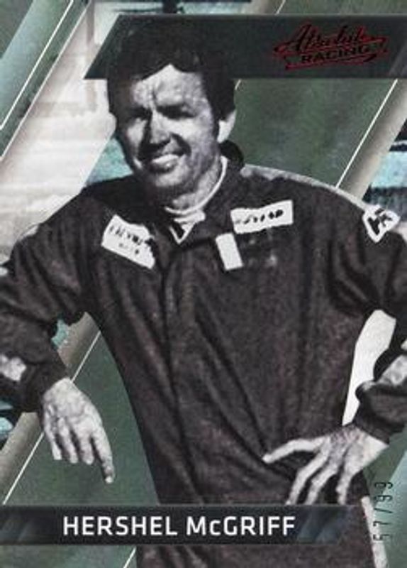 The Hershel McGriff 2017 Absolute NASCAR #22 Spectrum Red /99 card is 1 of 13 Hershel McGriff's card variations in the 2017 Absolute NASCAR set being tracked by Sports Card Investor, including Base, Spectrum Silver /299, Spectrum Blue /199, Spectrum Gold /25, and Printing Plates Black /1.
