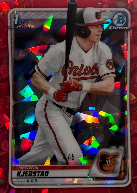 This card is 1 of 9 Heston Kjerstad's card variations in the 2020 Bowman Draft Sapphire Edition set being tracked by Sports Card Investor, including Chrome (1st), Chrome - Yellow /99 (1st), Chrome - Green /50 (1st), Chrome - Orange /25 (1st), and Chrome - Aqua /20 (1st).
