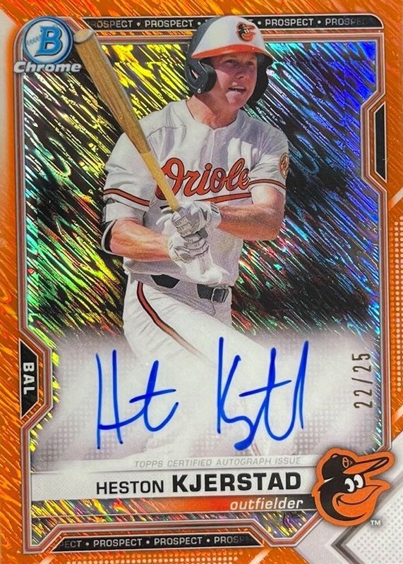 The Heston Kjerstad 2021 Bowman #CPA-HK Chrome Prospect Auto - Orange Shimmer Refractor /25 card in Raw condition has not changed in price in the last 30 days and was last sold for $48.65 .