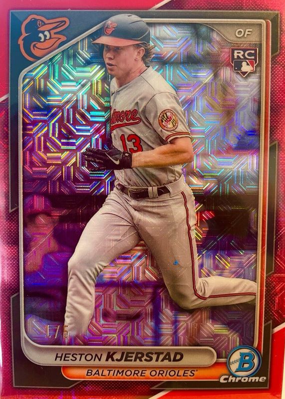 The Heston Kjerstad 2024 Bowman Chrome Mega Box #44 Red Mojo Refractor /5 Rookie card in Raw condition has not changed in price in the last 30 days and was last sold for $76.00 .