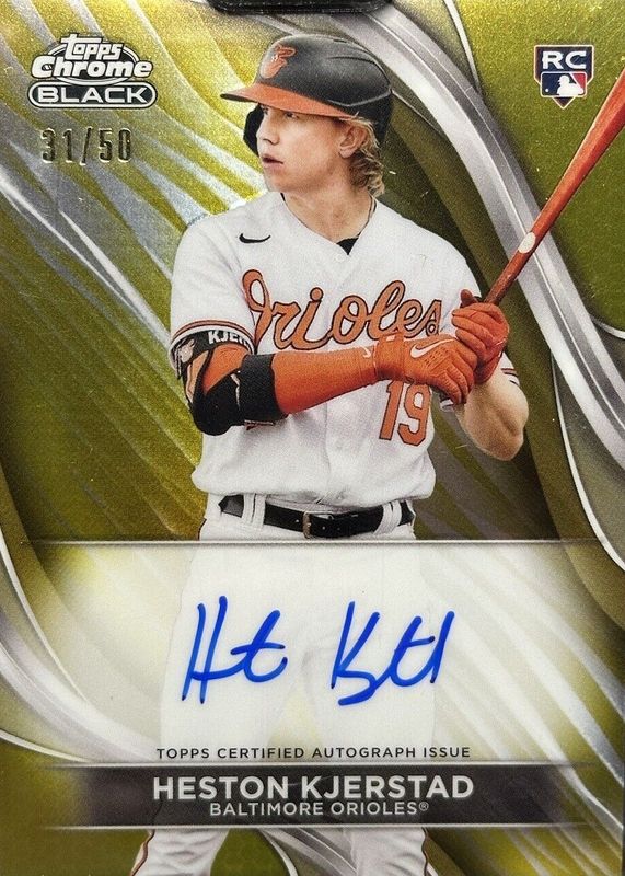 The Heston Kjerstad 2024 Topps Chrome Black #CBA-HKJ Autographs - Gold Refractor /50 Rookie card in Raw condition has not changed in price in the last 30 days and was last sold for $40.00 .