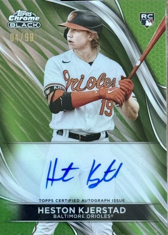 The Heston Kjerstad 2024 Topps Chrome Black #CBA-HKJ Autographs - Green Refractor /99 Rookie card in Raw condition has not changed in price in the last 30 days and was last sold for $22.71 .