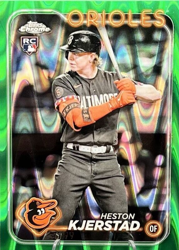 The Heston Kjerstad 2024 Topps Chrome #142 Green RayWave Refractor /99 Rookie card in Raw condition has not changed in price in the last 30 days and was last sold for $17.49 .