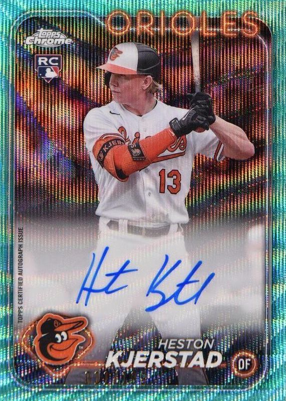 The Heston Kjerstad 2024 Topps Chrome #RA-HK Rookie Autographs - Aqua Wave Refractor /199 card in Raw condition has not changed in price in the last 30 days and was last sold for $21.00 .