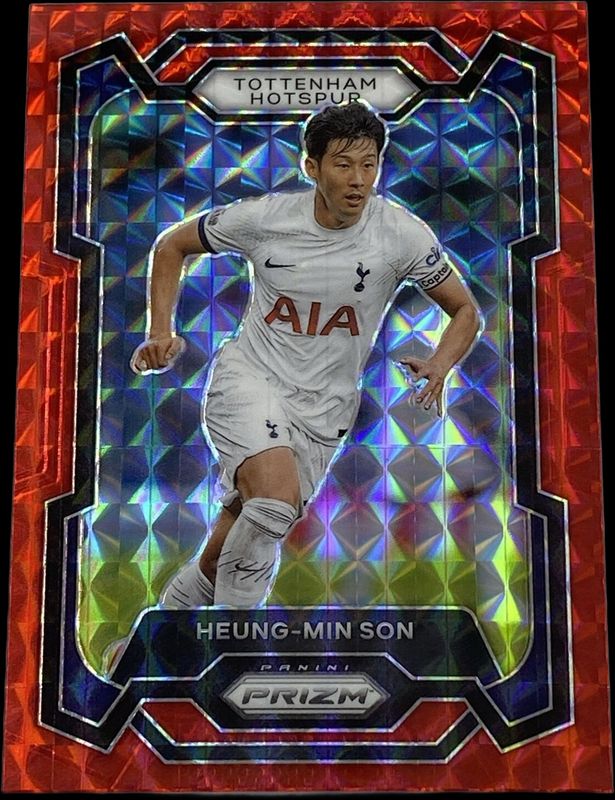 The Heung-Min Son 2023 Prizm Premier League #125 Red Mosaic card is 1 of 101 Heung-Min Son's card variations in the 2023 Prizm Premier League set being tracked by Sports Card Investor, including Base, Blue Mosaic, Breakaway, Breakaway Orange, and Choice.
