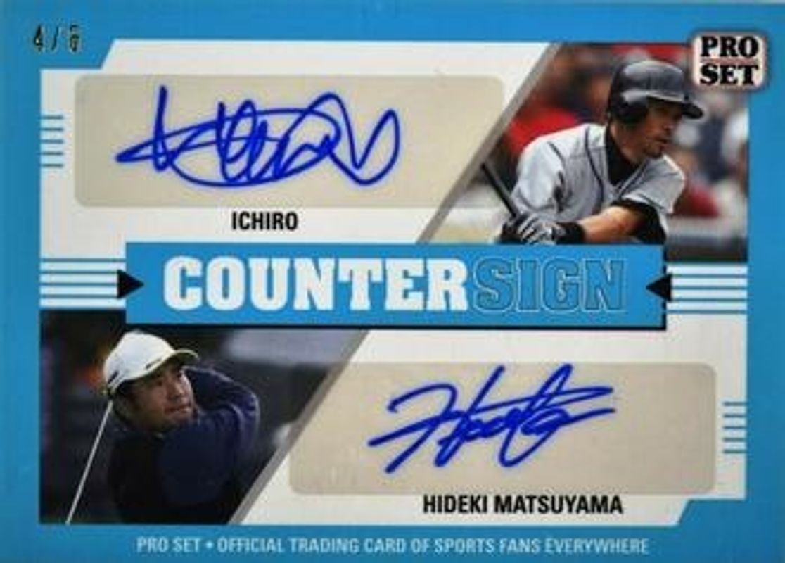 The Hideki Matsuyama 2021 Pro Set #CS-06 Countersign Light Blue /12 card is 1 of 16 Hideki Matsuyama's card variations in the 2021 Pro Set set being tracked by Sports Card Investor, including Base /75, Light Blue /25, Orange /7, Emerald /5, and Navy Blue /5.