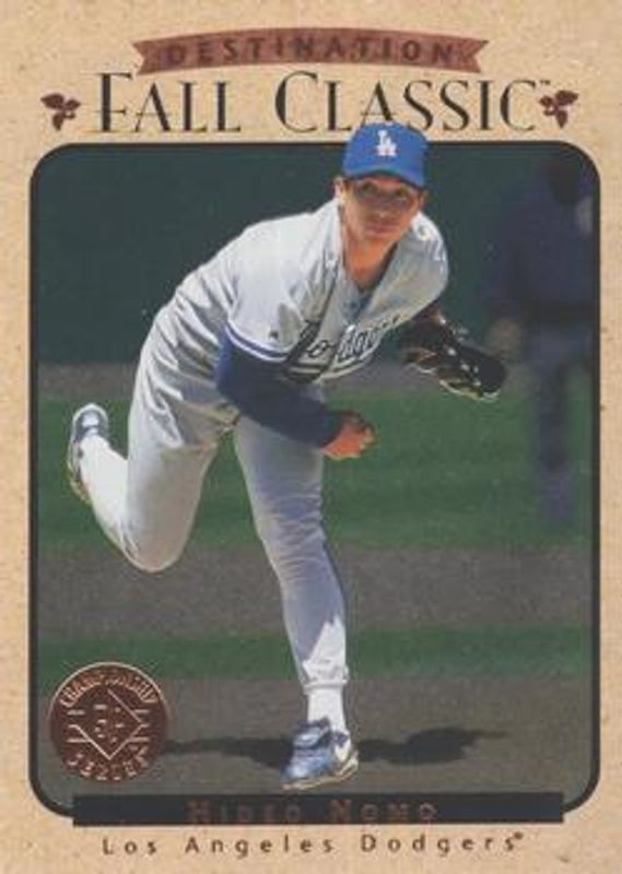 The Hideo Nomo 1995 SP Championship #6 Destination Fall Classic Rookie card is 1 of 4 Hideo Nomo's card variations in the 1995 SP Championship set being tracked by Sports Card Investor, including Base, Die Cuts, and Destination Fall Classic Die Cuts.