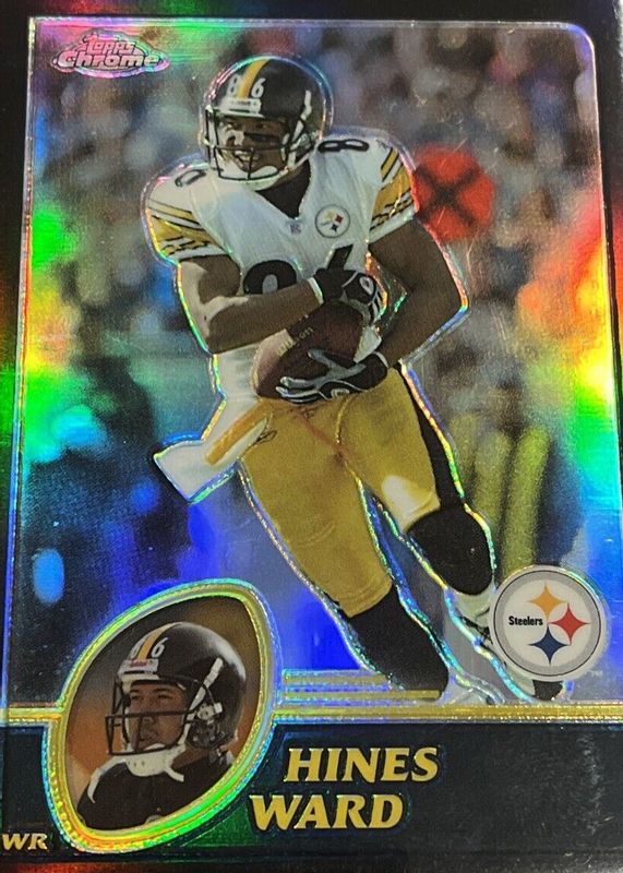 Hines Ward's Football cards are available in at least 149 sets. Hines Ward's biggest 7-day price movers are 2003 Topps Chrome #50 Black Refractor /599, 2025 Donruss #12 Press Proof Yellow, and 2025 Donruss #12 Press Proof Red.