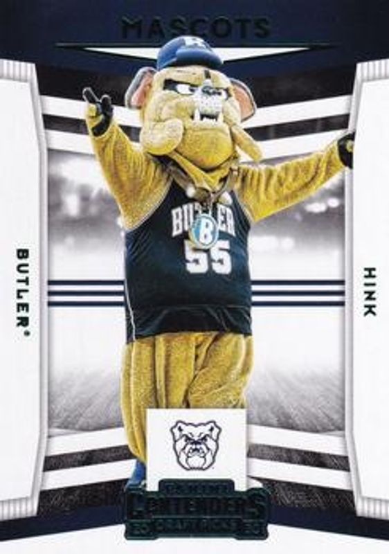 The Hink 2020 Contenders Draft Picks #16 Mascots - Green card is 1 of 7 Hink's card variations in the 2020 Contenders Draft Picks set being tracked by Sports Card Investor, including Mascots, Mascots - Red, Mascots - Blue /99, Mascots - Purple /99, and Mascots - Cracked Ice /23.