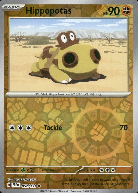 The Hippopotas 2025 Scarlet & Violet: Prismatic Evolutions #052/131 Reverse Holo card in Raw TCG (Near Mint) condition has not changed in price in the last 30 days and was last sold for $1.49 .