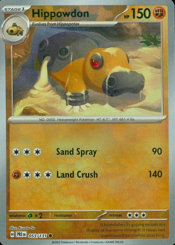 The Hippowdon 2025 Scarlet & Violet: Prismatic Evolutions #053/131 Poke Ball Reverse Holo card in Raw TCG (Lightly Played) condition has not changed in price in the last 30 days and was last sold for $1.19 .