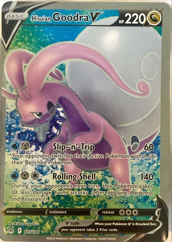 The Hisuian Goodra V 2022 Sword & Shield: Lost Origin #187/196 Holo (Full Art) card in Raw TCG (Near Mint) condition has moved up $1.15 (+50.4%) in the last 30 days and was last sold for $3.43 .