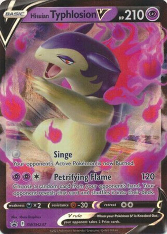 The Hisuian Typhlosion V 2022 Sword & Shield: Black Star Promo #SWSH237 Divergent Powers Tins card in Raw TCG (Near Mint) condition has moved down -$0.70 (-20.2%) in the last 30 days and was last sold for $2.75 .
