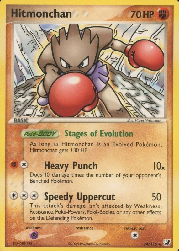 The Hitmonchan 2005 EX: Unseen Forces #024/115 Base card in Raw TCG (Near Mint) condition has not changed in price in the last 30 days and was last sold for $2.79 .