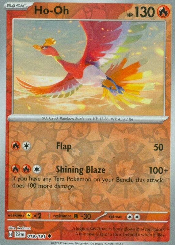 The Ho-Oh 2024 Scarlet & Violet: Surging Sparks #019/191 Reverse Holo card in Raw TCG (Near Mint) condition has moved up $1.03 (+70.5%) in the last 30 days and was last sold for $2.49 .