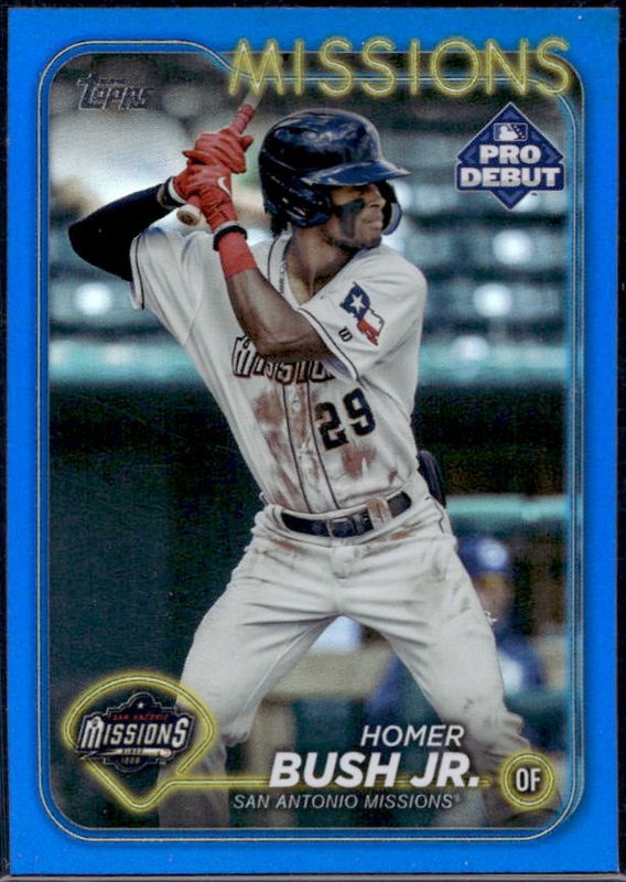 The Homer Bush 2024 Topps Pro Debut #PD-65 Blue Foil /150 card is 1 of 37 Homer Bush's card variations in the 2024 Topps Pro Debut set being tracked by Sports Card Investor, including Base, Fuchsia Foil /199, Sparkle Foil /175, Green Foil /99, and Aqua Foil /75.