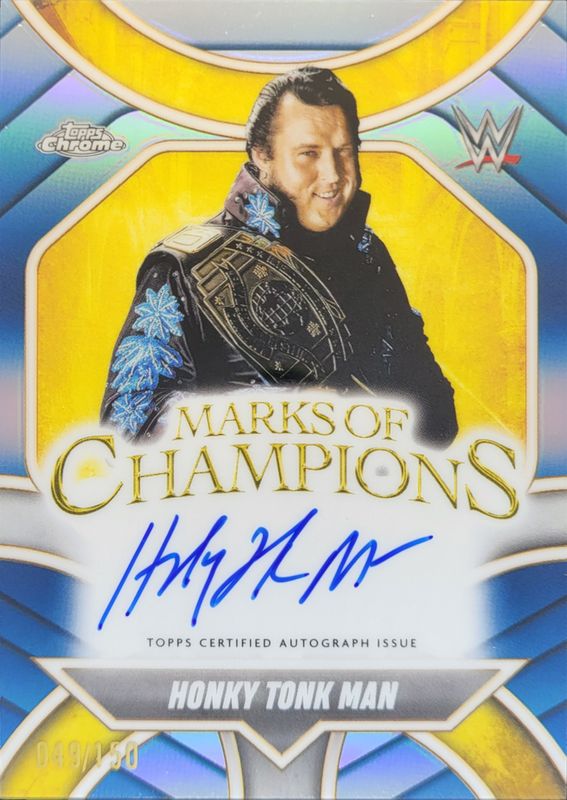 The Honky Tonk Man 2025 Topps Chrome WWE #MOC-HT Marks of Champions Autographs - Blue Refractor /150 card is 1 of 8 Honky Tonk Man's card variations in the 2025 Topps Chrome WWE set being tracked by Sports Card Investor, including Marks of Champions Autographs, Marks of Champions Autographs - Refractor /175, Marks of Champions Autographs - Gold Refractor /50, Marks of Champions Autographs - Orange Refractor /25, and Marks of Champions Autographs - Black Refractor /10.