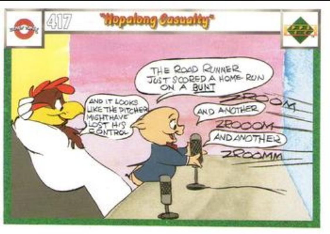 Other popular players in the 1990 Upper Deck Comic Ball set include Magnetic Field, Squeeze Play, Porky Pig and Charlie Dog, Acme Battle, and Curve Ball.