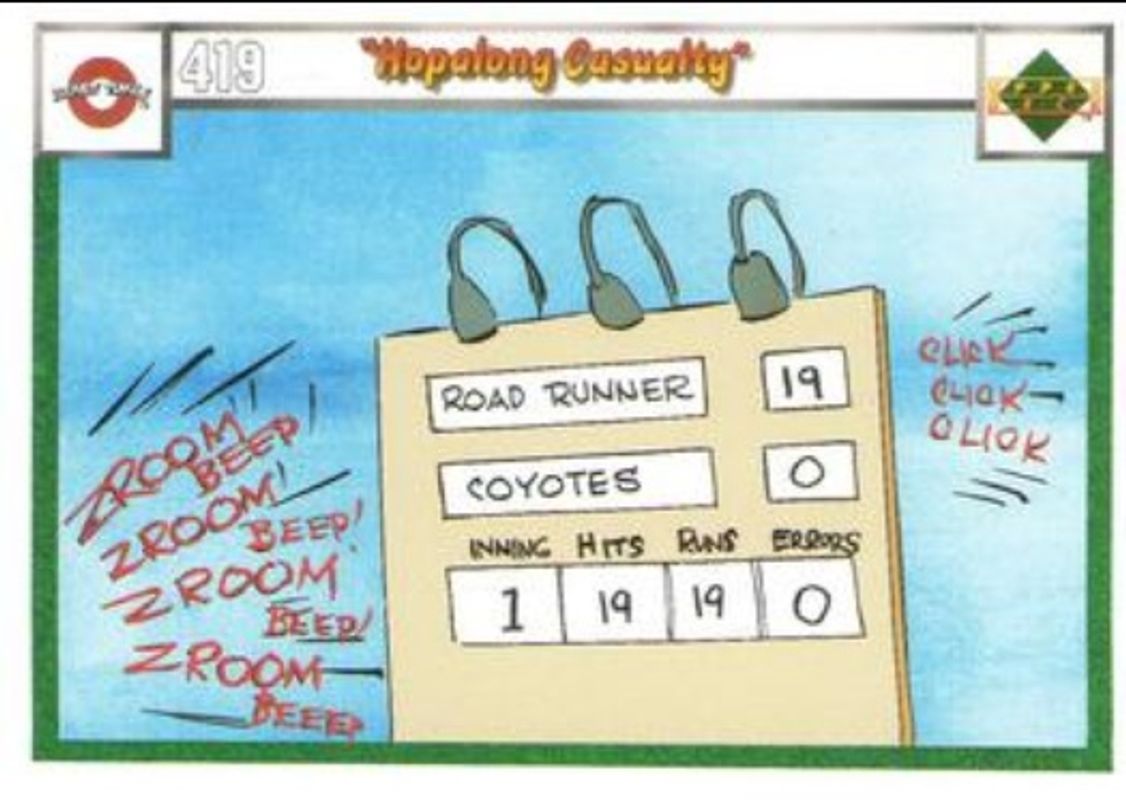 Other popular players in the 1990 Upper Deck Comic Ball set include Magnetic Field, Squeeze Play, Porky Pig and Charlie Dog, Acme Battle, and Curve Ball.