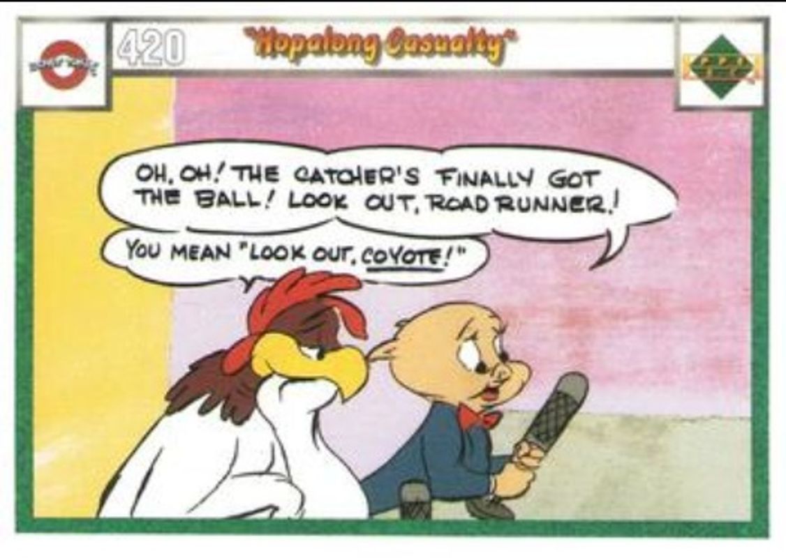 Other popular players in the 1990 Upper Deck Comic Ball set include Magnetic Field, Squeeze Play, Porky Pig and Charlie Dog, Acme Battle, and Curve Ball.